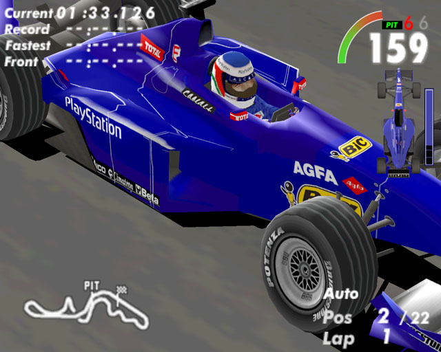 Senza fraintendimenti, è necessario assicurare sulla qualità del lavoro fino ad ora sviluppato: le texture possono contare su un’altissima definizione, ma le scelte cromatiche sono tali da rendere un effetto “plasticoso”, esaltando la rotondità dei poligoni ed avvicinandosi incredibilmente al risultato ottenibile con l’utilizzo delle superfici curve. I modelli adottati per la rappresentazione delle vetture possono contare su un altissimo numero di poligoni, contribuendo a ottenere un rendering di rara complessità. Il risultato ottenuto è una cosmesi originale, accattivante ed estremamente godibile, rendendo il tutto amalgamato ed omogeneo: un sistema grafico che appare ideale per ottenere suggestivi particolari, le caratteristiche scanalature sulle gomme su tutte. Non mancano i classici tocchi di classe, macchie d’olio e segno dei pneumatici sulla pista e sui cordoli per citarne alcuni, oltre alle classiche scintille dei motori o l’effetto di riflessione del sole, ormai d’obbligo. Suscitano però alcune perplessità particolari che, all’attuale stato di cose, sono stati evidentemente considerati in secondo piano; nella fattispecie, le costruzioni che circondano la pista virtuale non convincono fino in fondo, mostrando una parziale superficialità che si estrinseca soprattutto in una inadeguata riproduzione del pubblico