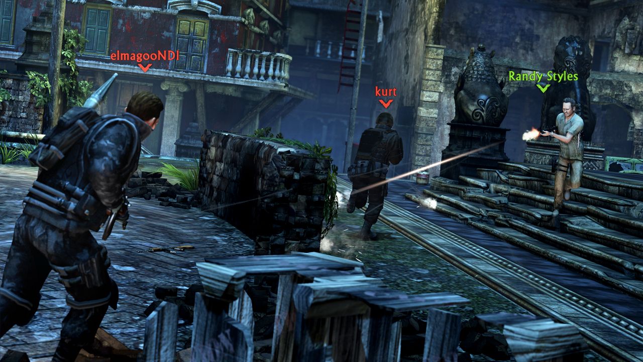 Molto simpatica, soprattutto se giocata in una comitiva completa di auricolari, ma ora è il momento della vera sfida. Noi di GameSurf siamo dei duri, quindi via di volata a mietere vittime in un Deathmatch a caso. Le mappe a disposizione sono due: Piazza e Villaggio. Entrambe piuttosto piccole e votate al massacro più totale, a dirla tutta, ma molto differenti sia per quanto riguarda il design che per l'atmosfera. La prima, al buio e riconoscibile per i suoi vasti spazi aperti, è il campo più semplice da padroneggiare. Le due basi avversarie sono divise da angusti vicoletti adiacenti ad una piazza di ampio respiro. Difficile nascondersi; perfetta per chi vuole falciare facilmente qualcuno senza andarlo prima a stanare. Il Villaggio, invece, è quella più complessa. Dedali di casupole e stradine si diramano su più livelli, smorzando il campo visivo e costringendo così il giocatore a controllarsi continuamente il didietro. Le regole sono semplici: un massimo di 10 giocatori si divideranno in due squadre opposte da 5 membri ciascuna.Vince il team che raggiunge per primo le 50 uccisioni, oppure che ha totalizzato il maggior punteggio allo scadere del tempo. La principale peculiarità dell'online è la medesima che contraddistingue il gioco. Definire Uncharted un Third Person Shooter è fin troppo restrittivo, viste e considerate le doti salterine del protagonista. Sulla falsariga dell'avventura principale, quindi, anche il multigiocatore si bea di una pesante impronta platform. Se è vero che le sparatorie si basano completamente sulla continua ricerca di una copertura e sul fuoco da sopra la spalla, è altrettanto vero che la struttura delle zone permette di arrampicarsi e arrivare in luoghi nuovi, magari per guadagnarsi una posizione di vantaggio o per raggiungere e soffocare in una morsa letale il cecchino di turno. Ciò non significa che, nonostante il passare degli anni, Uncharted sia rimasto identico a sé stesso. Anzi, fin da subito saltano all'occhio le prime differenze. Pad alla mano, i personaggi risultano molto più pesanti che in passato, ad esempio. Una scelta, probabilmente, atta a bilanciare il più possibile gli scontri con altri giocatori umani. Stessa cosa per il rinculo, incrementato al fine di rendere le sparatorie dalla lunga distanza ancor più realistiche.
