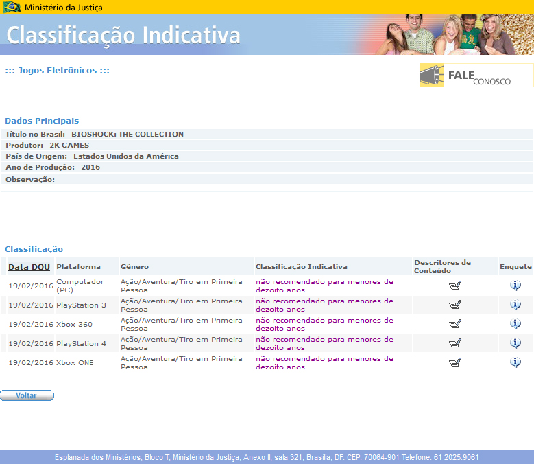 L'ente brasiliano di classificazione potrebbe aver anticipato l'annuncio di una fantomatica BioShock: The Collection. Questo pacchetto, immaginiamo, potrebbe includere la trilogia con relativi DLC. Sicuramente si fa notare come tra le piattaforme siano presenti oltre a PC e console di vecchia generazione, Playstation 4 ed Xbox One, che della serie 2K non hanno ancora visto arrivare nessun capitolo.