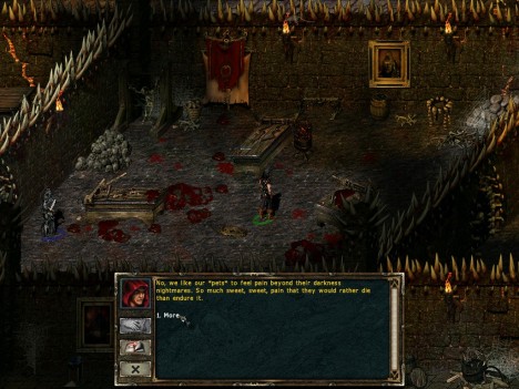 La vostra prima missione sarà quindi fuggire dal dungeon in cui siete stati rinchiusi e ritrovare la vostra libertà. C'è subito da dire che i dialoghi, scritti e parlati, saranno tutti in inglese (manuale compreso). Tuttavia, i suddetti dialoghi, per chi abbia dimestichezza con l'albionico idioma, si riveleranno, spesso, quanto meno esilaranti, dato lo humour nero che permea, in particolare dalla bocca del nostro amico Death Knight e dai personaggi di contorno. Ma parliamo anche del “succo”di ogni RPG che si rispetti, ovvero gli oggetti che contribuiscono a rendere un personaggio più o meno potente di un altro. BD esibisce un campionario di oggetti, armi, pozioni e quant'altro che non ha nulla da invidiare ad alcun altro RPG più blasonato. Sono inoltre implementate le funzioni di potenziamento tramite rune o pietre preziose o tramite l'affilamento della lama dell'arma. La sezione dedicata al commercio è completa, con la possibilità di comprare, vendere, e identificare le armi sconosciute trovate sul campo di battaglia. Una caratteristica che può far storcere il naso è anche l'implementazione dell'usura dell'arma, che può essere eventualmente riparata dal personaggio del giocatore, se in possesso dell'abilità di fabbro.