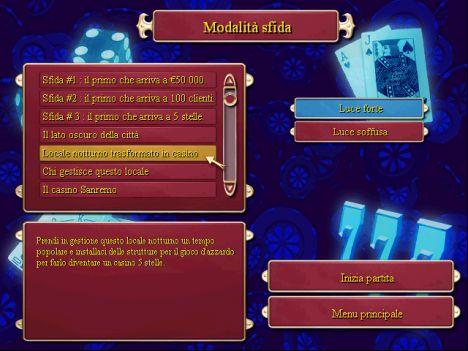 La prima cosa che dovremo fare, una volta scelta la difficoltà, sarà decidere se giocare una partita “libera” la cosiddetta modalità “Allenamento”), oppure confrontarci con uno “scenario” o in una “sfida” (questi due tipi di gioco rinchiusi solo nel nome “Sfida”). Nel primo caso dovremo solo decidere lo “stile” (Orientale o Montecarlo) del Casinò, e poi saremo liberi di iniziare la nostra carriera da 0. Nel secondo caso (scenario) ci verrà affidato un Casinò già parzialmente riempito che ha però grossi problemi a cui porre rimedio. Le sfide, infine, sono concettualmente identiche alla partita “libera”, con la differenza che ci sono determinati traguardi (n° di clienti, fondi economici, livello del casinò espresso in “stelle”) da raggiungere prima di un avversario virtuale in pratica un limite di tempo).