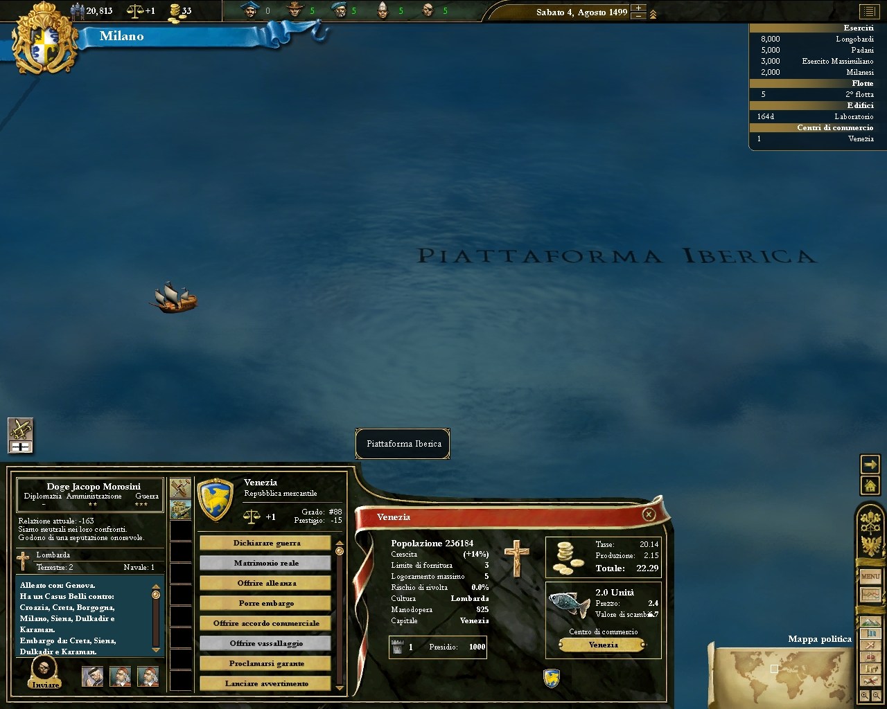 Mentre vengono introdotte tra i reparti degli eserciti distinzioni militari importanti (cavalleria pesante e leggera, diversi calibri di cannoni) è necessario chiarire che, Maestro Sun Tzu inegna, la battaglia è praticamente l'ultima opzione a cui due stati dovrebbero ricorrere. Tanto più che il gioco, senza la presenza di un “casus belli”, un motivo per dichiarare guerra, sarà impossibile portare le proprie truppe in un territorio nemico. Starà alla nostra abilità, moderni Cavour messi alla guida di stati tardo-medievali e rinascimentali piuttosto che dell'Italia pre-unitaria, cercare le giuste alleanze e le giuste motivazioni per decidere quando è il momento di muovere le nostre pedine, pena la perdità di punti Prestigio.