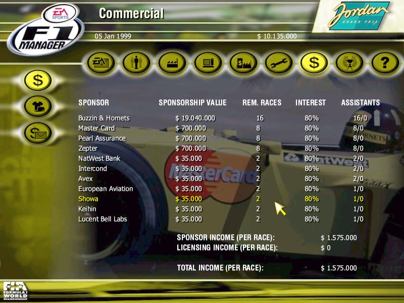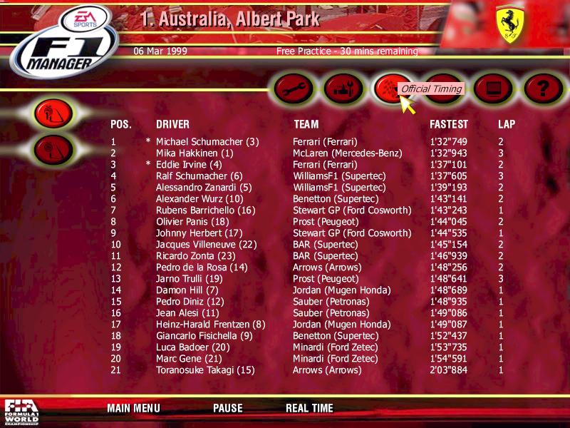 Simulazione manageriale/motoristica, F1 Manager va a inserirsi in discreta sordina e privo di suffisso temporale nel pacchetto sportivo della Electronic Arts commercializzato nel 2001. Dovute precisazioni sulla natura del prodotto dovrebbero evidenziare la predisposizione flemmatica e puntigliosamente gestionale del gioco installato: pazienza da vendere e indubbia capacità manageriale rappresentano le irrinunciabili prerogative per apprezzare appieno il titolo in questione. Messa da parte la canonica introduzione a base di motori rombanti, monoposto incandescenti, box in fibrillazione e donnine a stemperare le tensioni di gara, ci tufferemo nei panni sponsorizzati di uno dei manager di scuderia del mondo della Formula 1La selezione del figuro da impersonare spazierà dal giallo canarino di Eddie Jordan al pacchiano argento vivo del serioso Ron Dennis, passando per l'inconfondibile rosso del "nostro" Jean Todt o per il tartan di casa Stewart. Ovviamente basato sulla semplicità e sull'immediatezza delle interfacce di gioco, F1 Manager metterà l'utente dinanzi a una schermata iniziale del team ben congegnata: icone primarie e secondarie saranno la chiave d'accesso a caselle di posta elettronica dal mondo della Formula 1, alla gestione del personale di squadra, tra cui capo design, direttore tecnico, manager commerciale, numero di piloti di prima e seconda guida e numero di collaudatori, alla sezione fornitori di componentistica specializzata (volta alla produzione di motori, parti elettroniche e freni), alla parte relativa al design minuzioso di ogni elemento della vettura e a tutto ciò che può essere racchiuso nella voce produzione, ovvero assemblaggio delle parti meccaniche su monoposto di prima scelta o su muletti di riserva