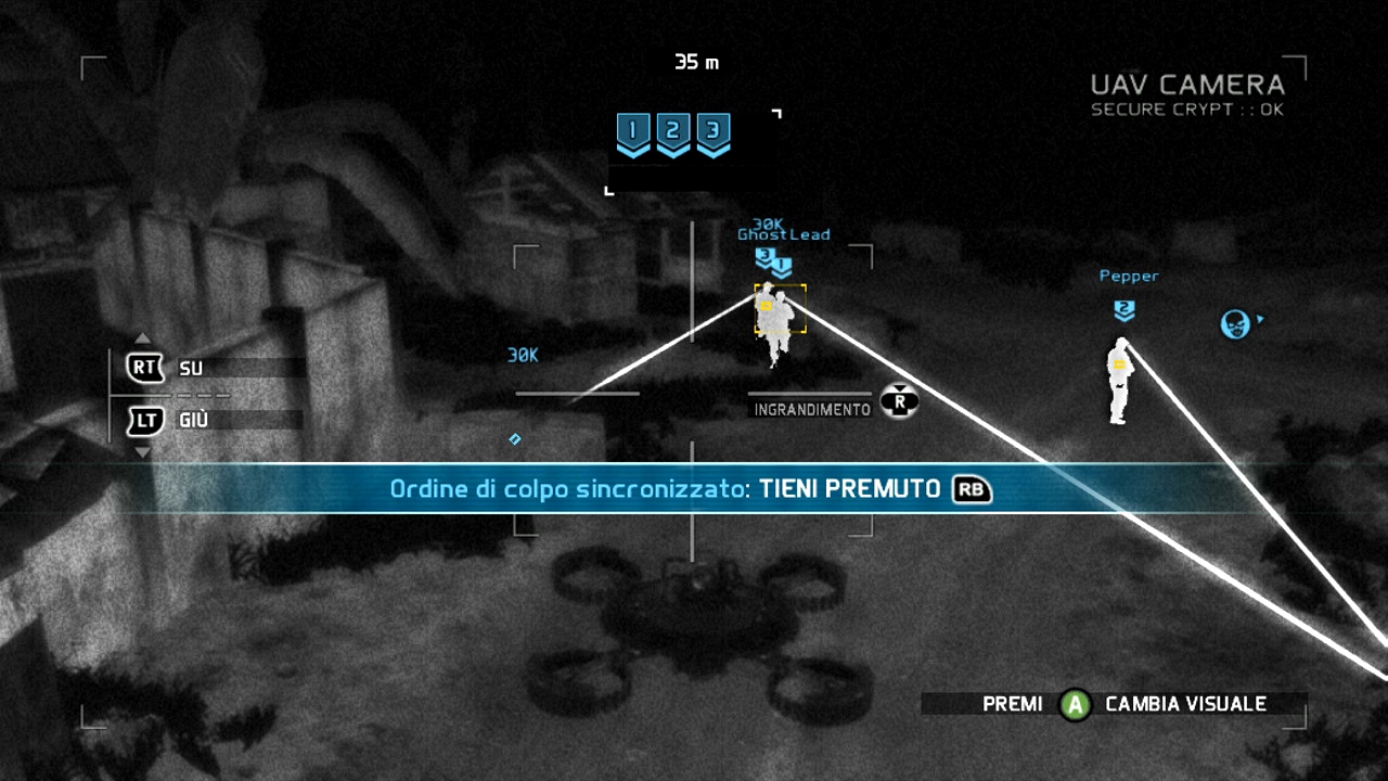 Mettiamo subito le cose in chiaro, quindi. Il gameplay che ha accompagnato fino ad ora le azioni del team Ghost non c'è più. Nessun comando da impartire ai commilitoni, nessuna valutazione sul campo per decidere dove far schierare i propri compagni di squadra, nessuna tensione derivante dal fatto che un singolo colpo ben assestato potrebbe significare il temuto “Game Over”. Al suo posto troviamo un qualcosa che cerca di richiamare tutto questo, ma senza riuscirci appieno. I comandi ai compagni si sono limitati al “cecchinaggio coordinato” (cosa peraltro già visto anche in titoli molto meno nobili come Army of Two), dove potremo marcare 4 obbiettivi da abbattere in simultanea. Oppure segnalare un nemico particolarmente ostico da buttare giù, o una postazione fissa, o un carro armato verso cui concentrare una massiccia potenza di fuoco. Stop. Più o meno l'interazione con i nostri compagni finisce qui.