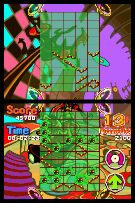 In questo caso sarà come giocare due partite contemporaneamente e in ogni momento potrete scambiare gli schermi per poter decidere in quale intervenire.Il multiplayer è anche lui piuttosto ordinario. Avrete la possibilità di sfidare un amico in locale, per giunta è espressamente richiesto che possegga anch'egli la cartuccia originale. Non è infatti possibile il la sfida tramite download e potrete al massimo inviargli una demo del gioco. Parlando dei sistemi di controllo, i possessori di Nintendo Ds possono veramente stare allegri. Se tutti coloro che hanno avuto a che fare con Gunpey in altre versioni hanno dovuto fare i conti con i controlli direzionali, non particolarmente semplici per muoversi velocemente tra gli elementi del reticolo che compongono lo schema, qui invece l'utilizzo del pennino e del touch screen consente di spostarsi facilmente da un punto all'altro, riuscendo a eseguire i movimenti egli elementi con una velocità altrimenti non raggiungibile. Per cercare di togliere un po' il peso degli anni da questo platform, alla Bandai hanno cercato di dargli una veste grafica il più possibile colorata e fumettosa. Tutti i menù e i personaggi che incontrerete nel corso dei livelli, rispondono perfettamente a questa linea guida e riescono a dare un'apparenza molto gradevole a un gioco che altrimenti, se andiamo ad esaminare i suoi elementi essenziali, sarebbe alquanto spartano.