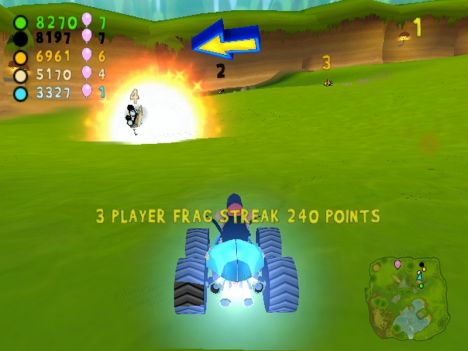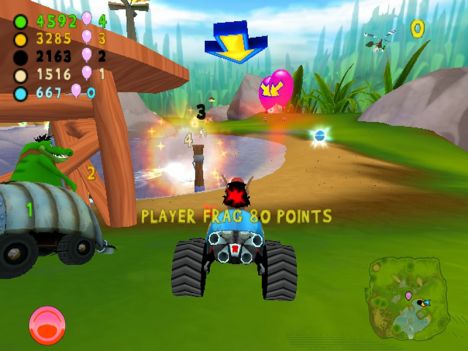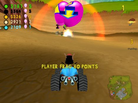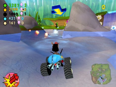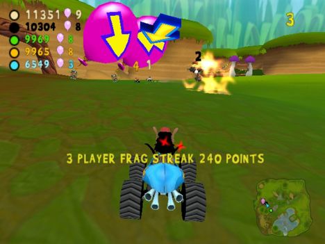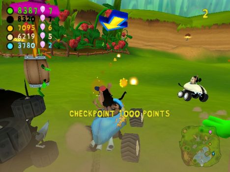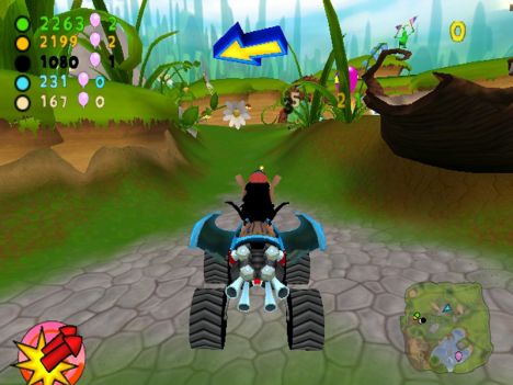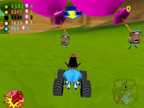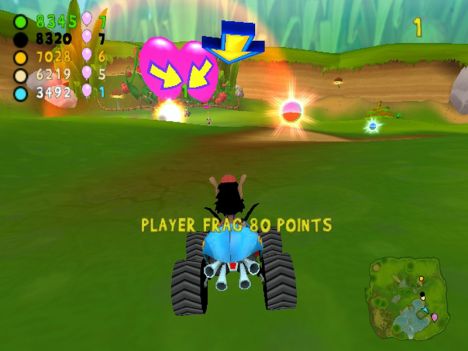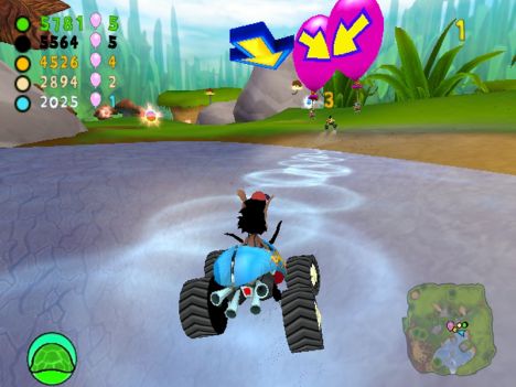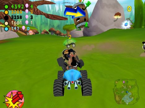 A conti fatti, comunque, lo schema di gioco si può riassumere nel dover raggiungere determinati CheckPoint (siano essi porte o basi), con o senza un oggetto (palloncino o insetto che sia). A complicare le cose e a differenziare più marcatamente le modalità, gli sviluppatori hanno pensato di aggiungere un po' di pepe: oltre ai vari PowerUp con cui i contendenti potranno ostacolarsi a vicenda (PowerUp di cui parlerò tra un momento), infatti, niente sarà semplice come sembrerebbe. Nelle modalità con l'insetto, infatti, questo originariamente sta su un'automobilina che farà di tutto per non farsi acchiappare, mentre nelle modalità con le porte CheckPoint (porte delimitate da due barili contenenti un insetto a cui è legato un palloncino enorme) quest'ultime avranno l'antipatica abitudine di “saltellare” di lato o circolarmente per non inforcare. Giocando al livello massimo di difficoltà, mi son trovato più volte in situazioni in cui sia io sia i tre corridori pilotati dall'IA continuavamo a girare affannosamente intorno ad un CheckPoint che sembrava più inafferrabile di un fantasma.