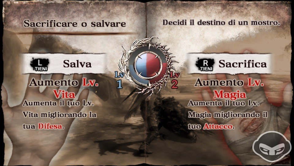 Per i nemici comuni, si tratterà essenzialmente di decidere se recuperare vita (Salvezza) o se recuperare Offerte (Sacrificio), tenendo presente però che ciascuno di questi atti andrà a modificare i parametri di attacco/difesa del personaggio. A lungo andare, Salvezze e Sacrifici aumenteranno il livello di Vita e di Magia, andando nel contempo a modificare il braccio destro del protagonista, rendendolo volta per volta Neutro, Santo o Oscuro. Questa differenza, oltre a modificarne i valori di base, stabilirà quali effetti speciali possano essere ottenuti da alcuni “Sigilli” che sarà possibile volta per volta incidervi sopra.
