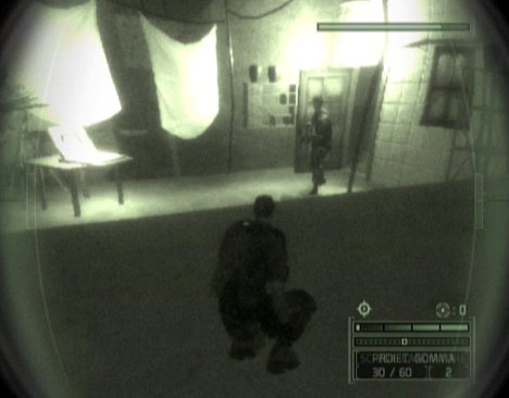 Utilizzate l'equipaggiamento furtività ed iniziate la missione, percorrete il breve corridoio e raggiungete la zona antistante la zona di controllo dell'impianto di aerazione (fig. 65) senza farvi notare. Attendete che la prima sentinella passi dalle vostre parti per coglierla di sorpresa ed interrogarla, arrampicatevi sulla parete metallica e liberatevi del secondo soldato prima di bloccare l'impianto di ventilazione. Raggiungete il centro della sala e forzate la botola, agganciate la corda al bordo della stessa e scalate la parete del condotto (fig. 66). Percorrete il condotto e scendete al livello inferiore, equipaggiate il fucile con le pallottole lacrimogene ed usate il cavo ottico per constatare la presenza di quattro loschi figuri impegnati in un'interessante conversazione. Senza attendere che escano dalla sala aprite la botola e mettetevi sul lato destro della stessa ( il rumore farà insospettire i presenti), attendete che i nemici siano a tiro (tutti vicini) e sparate un lacrimogeno in modo da metterli fuori combattimento senza far scattare alcun allarme (fig. 67).