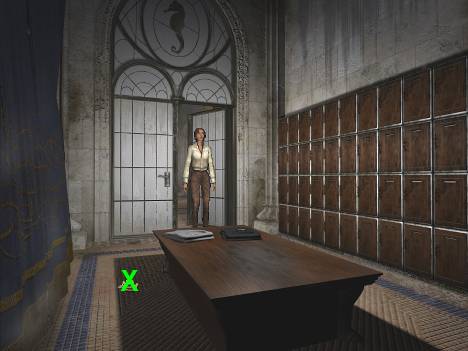 Costeggiate la chiesa passando davanti all'ascensore (img 9) e raggiungete la sagrestia. Esaminate il crocifisso appeso sul muro antistante l'ingresso, poi usatelo e prendete la chiave. Adesso esaminate la cassettiera e usate la chiave appena presa nella serratura in alto a destra: sbloccherete così tutti e 5 i cassetti. Apriteli a uno a uno: in ciascuno di essi troverete una scheda perforata che dovrete prendere, tranne nel terzo, in cui apparentemente non c'è nulla di utile. Usate la leva a destra mentre il cassetto è aperto per aprire il doppio fondo (img 10) e prendere la lettera del parroco e la chiave Voralberg.